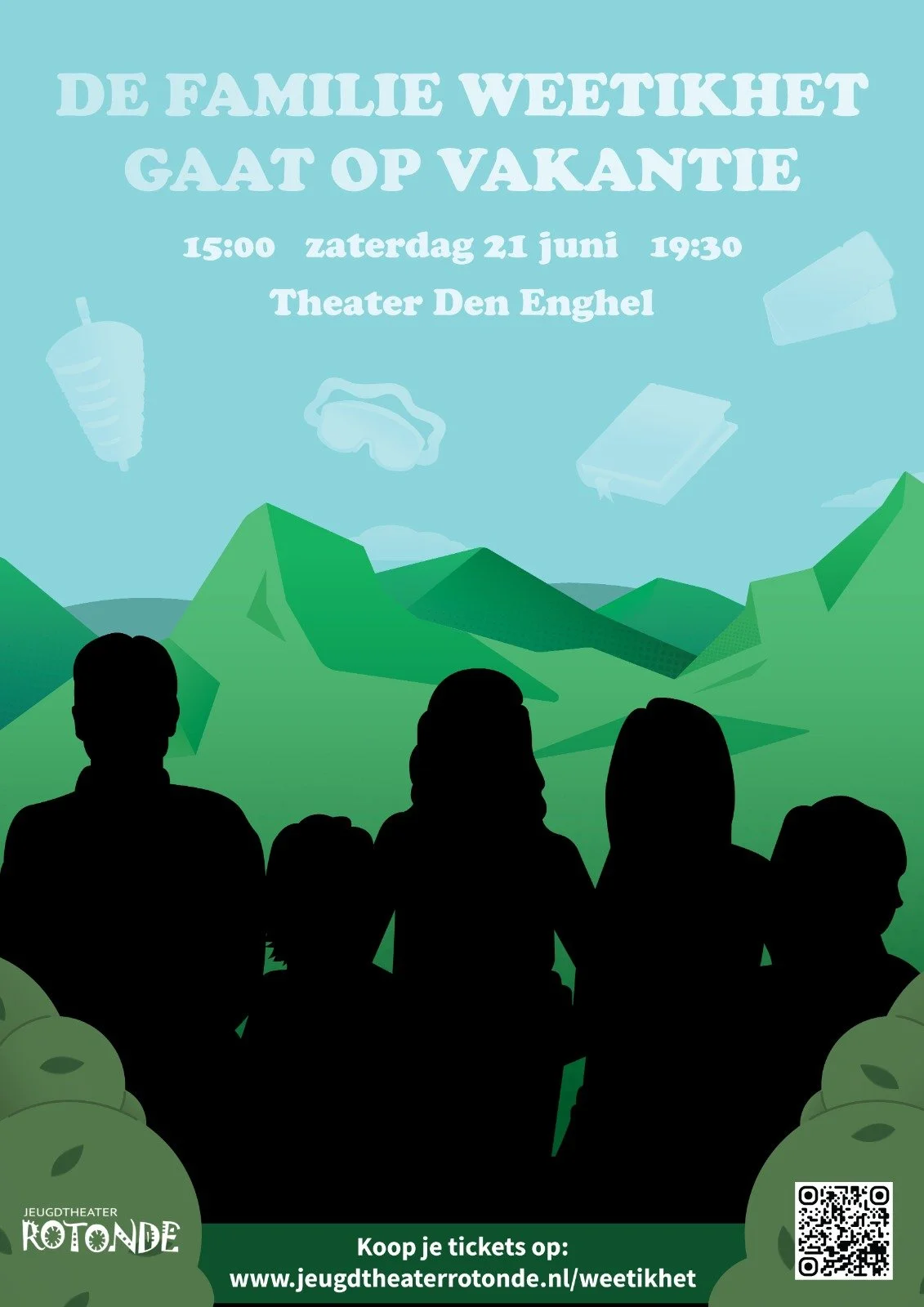 De Familie Weetikhet Gaat Op Vakantie is het eerste toneelstuk van de nieuwe Junioren-groep van Jeugdtheater Rotonde: een tienkoppige theatergroep van kinderen tussen de 8 en 14 jaar oud. Het stuk laat je op een humoristische en luchtige manier zien hoe je óók met tegenslagen om kan gaan en nodigt je uit om eens wat optimistischer in het leven te staan. Stap in bij Nikki, Lisa, Saartje & Mevrouw en Meneer Weetikhet en geniet van een onvergetelijke zomer!